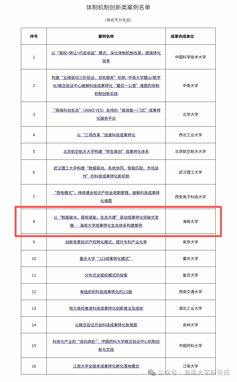 近日,教育部高等学校科学研究发展中心正式发布2025年高校科技成果转化典型案例名单,海南大学申报的《以“制度破冰、服务赋能、生态共建”驱动成果转化突破式发展》成功入选全国16个体制机制创新类典型案例。